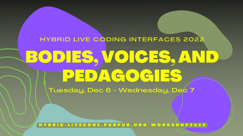 How are you reflected through your code? Is your identity found in your on-the-fly decisions? What does your body do when you code? Does it touch, move, shift, breath through the keyboard, screen, code, algorithms? How have you learned live coding? How do you approach teaching live coding? What philosophies influence your pedagogy? What history shapes your method? How does the past, present, or future shape how you code? How does it shape how you talk about code …….. and a lot more.